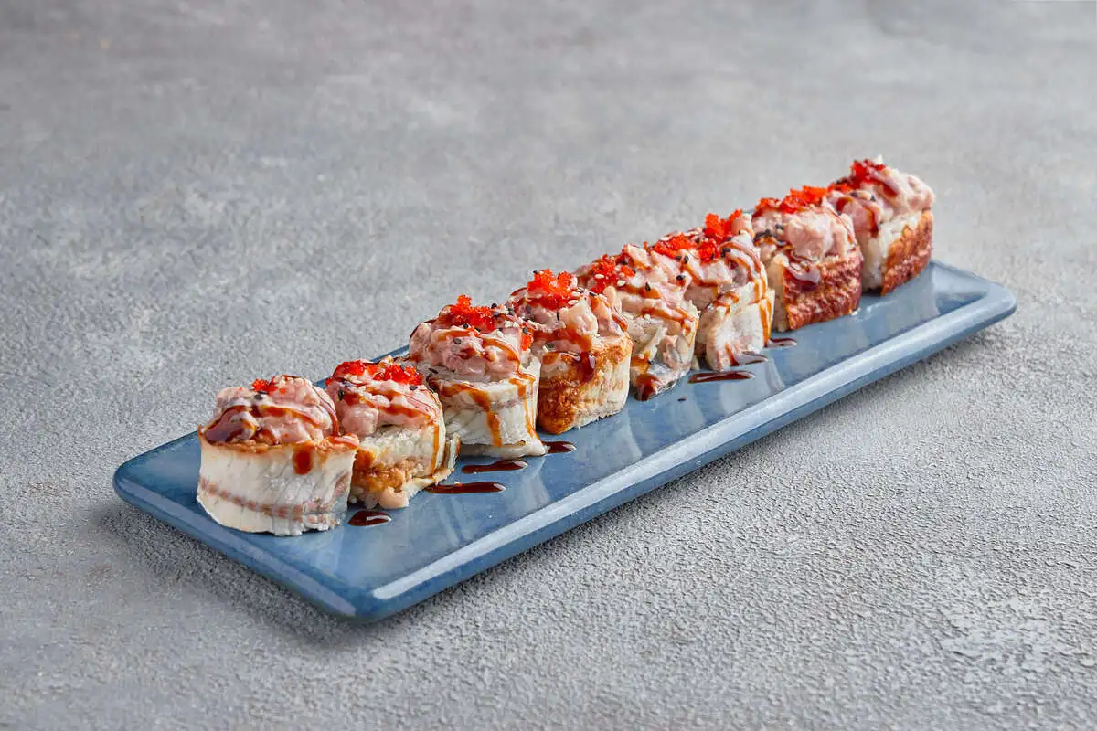 Запеченный ролл с лососем и унаги, Запеченный ролл с угрем и унаги, Темпура ролл с окунем и соусом майо