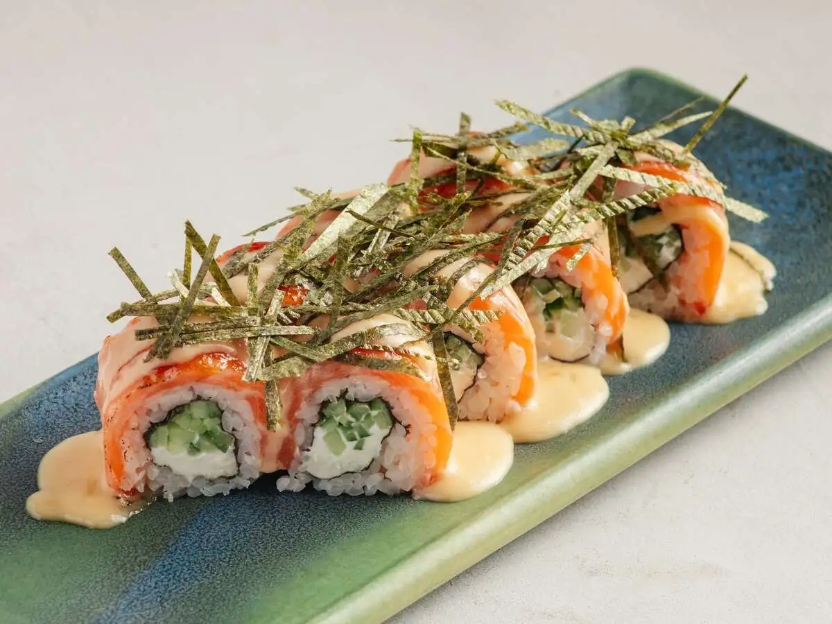 Лосось, сливочный сыр, огурец, тростниковый сахар, голландский соус (классический французский соус на основе яичных желтков с добавлением светлой мисо-пасты), украшается нори