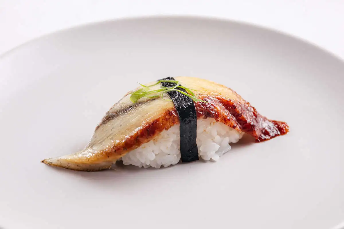 Нигири: тунец (1 шт.), лосось (1 шт.), угорь (1 шт.), креветка (1 шт.), окунь (1 шт.)